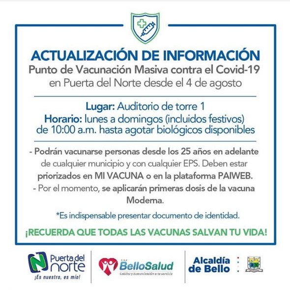¡El norte lo tiene todo! Juntos saldremos adelante Organizan: Puerta del Norte / Proaburrá Norte / Sena / Cámara de Comercio Apoyan: Alcaldía de Bello, Alcaldía de Copacabana, Alcaldía de Girardota, Alcaldía de Barbosa, Fundación CFA, Del Campo Girardota ____________________________________________________________________ EVENTOS PERMANENTES CLASES DE YOGA con Smarfit: Sábados y domingos / 9:00 a.m. / Auditorio, Torre 1 Cupo limitado – Inscripciones: 482 77 92 CLASES DE AERÓBICOS: Con Inder Bello / Miércoles y viernes / 7:00 p.m. / Entrada principal Torre 1 Cupo limitado. ESCUELA DE SABERES: Agosto – septiembre: bisutería / Miércoles y jueves – 1:00 p.m. – Torre 2 Inscripciones: 2 al 6 de agosto (o hasta agotar cupos) / de lunes a viernes / 9:00 a.m. a 12:30 m. / a través de la línea: 482 77 92 Cupo limitado. |