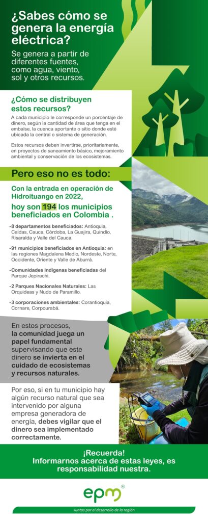 Gracias a las transferencias del sector eléctrico, durante 2024, EPM entregó $195.000 millones en recursos de ley para invertir en acciones de protección de cuencas y apalancar proyectos de desarrollo en los municipios de las áreas de influencia y cuencas aportantes de las centrales de generación en operación de la Empresa.