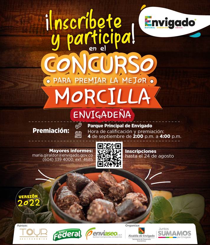 La Secretaría de Desarrollo Económico con el objetivo de resaltar y reconocer la tradición y cultura gastronómica, invita a empresarios y emprendedores envigadeños a participar en la convocatoria para el concurso de la “Mejor morcilla tradicional Envigadeña 2022”.