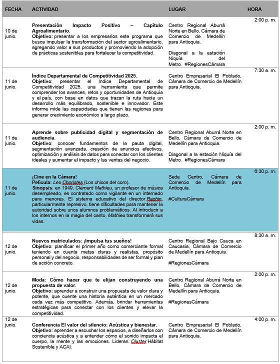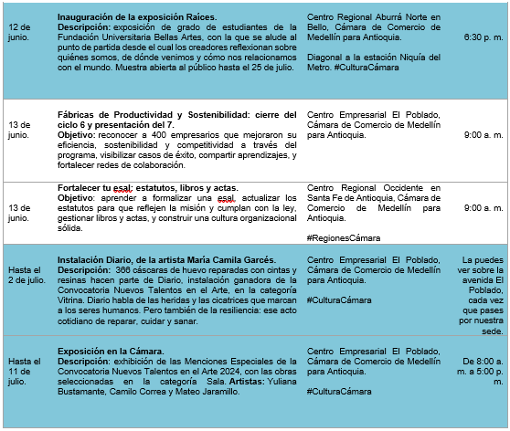 FECHAS:  del 9 al 13 de junio, entre ellos, la presentación del Índice Departamental de Competitividad 2025 y la inauguración de la exposición Raíces. Consulta nuestros eventos