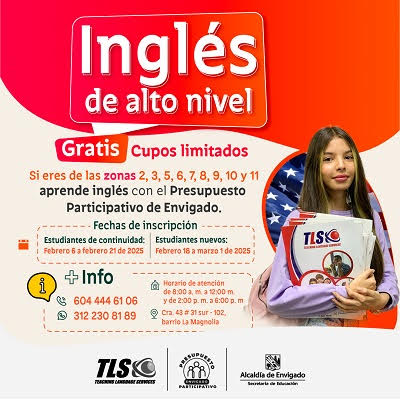 La Alcaldía de Envigado invita la comunidad de las zonas: 2, 3, 5, 6, 7, 8, 9, 10 y 11; para que conozcan y se inscriban en los cursos de inglés y fortalezcan su competencia y aprendizaje de una segunda lengua.