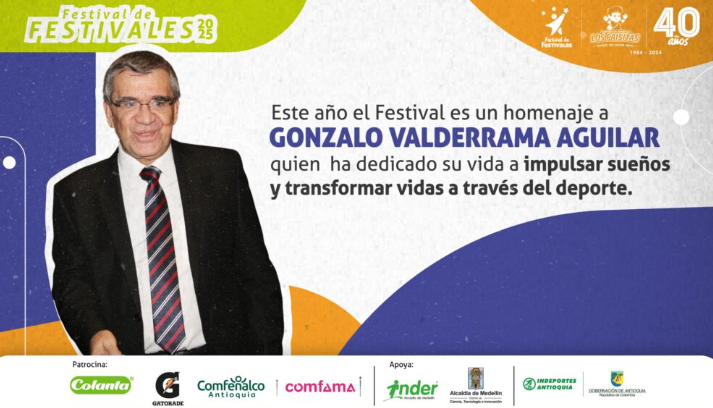 El Festival de Festivales se realizará en homenaje al socio Gonzalo Valderrama Aguilar, y será del 4 al 18 de enero de 2025 en la Unidad Deportiva Atanasio Girardot, en la Unidad Deportiva de Belén, Comfenalco Antioquia y en el Coliseo Tulio Ospina de Bello.