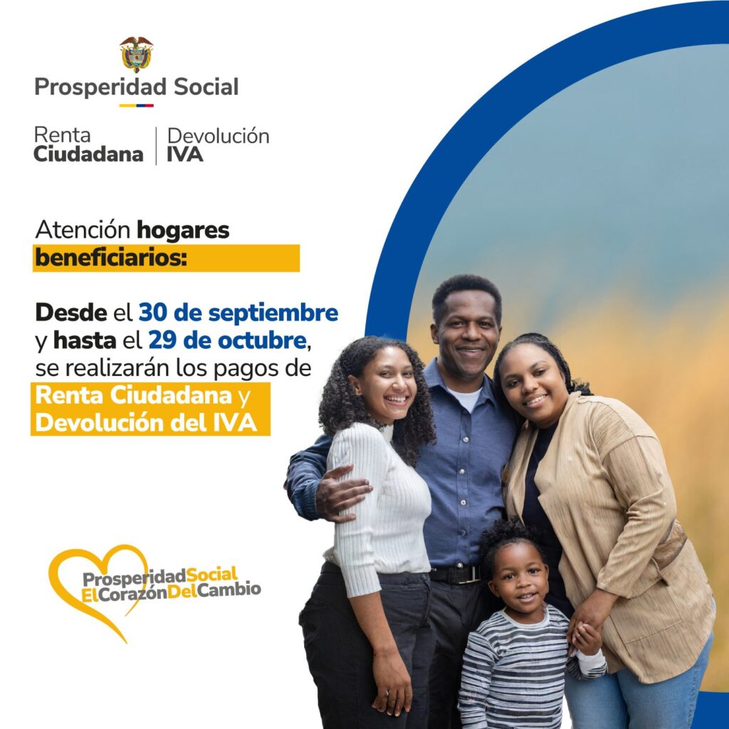 Más de 3 millones de hogares colombianos se beneficiarán con los pagos de Renta Ciudadana y Devolución del IVA, que comenzaron el 30 de septiembre y se extenderán hasta el 29 de octubre, impactando a más de 9 millones de personas en condición de vulnerabilidad o pobreza extrema.